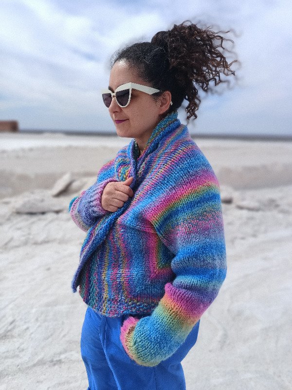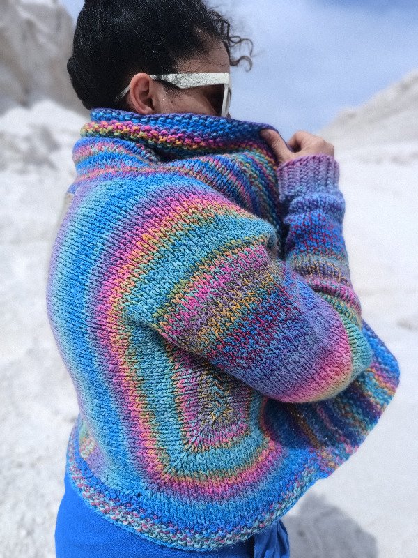 La construcción de este cardigan es empezando por el puño hacia el cuerpo, construyendo las dos mitades espejadas. El detalle principal de diseño es que en los costados del cuerpo haremos los aumentos sobre dos diagonales desde el costado hacia las puntas, lo que lo hace ideal para hacerlo rayado o con un hilado selfstriping. También podés usar la técnica de MARBLE: usar dos hebras del mismo o distinto color al mismo tiempo, e ir variando una para crear rayas.
