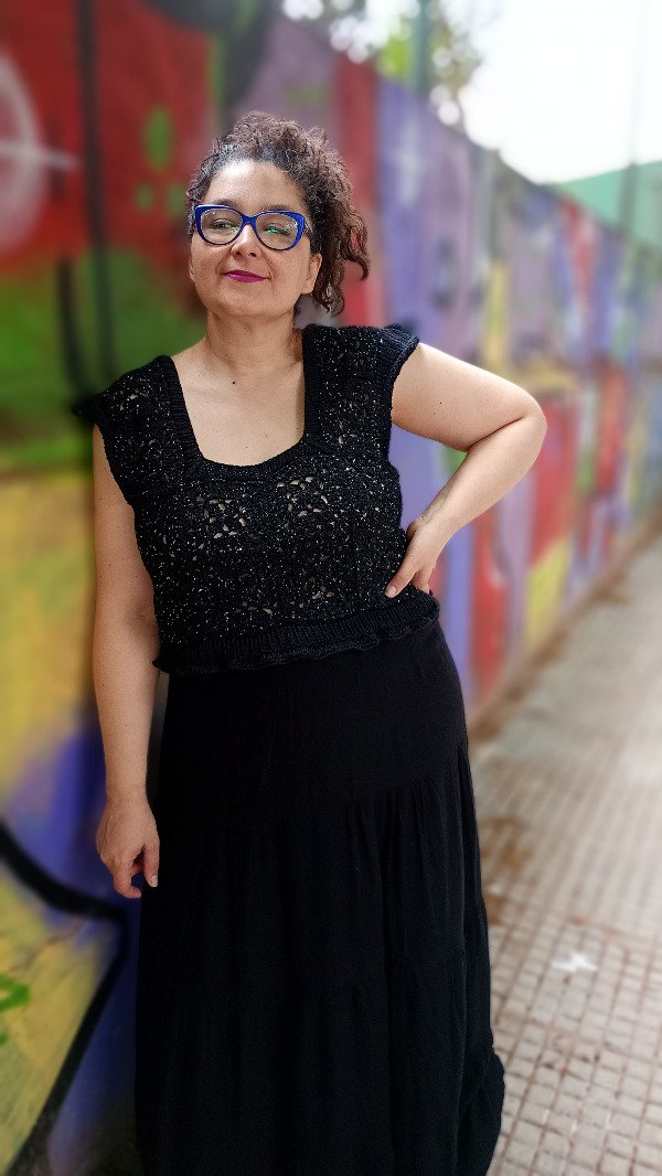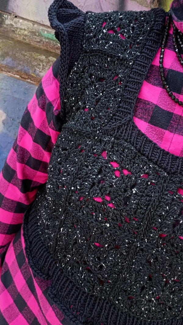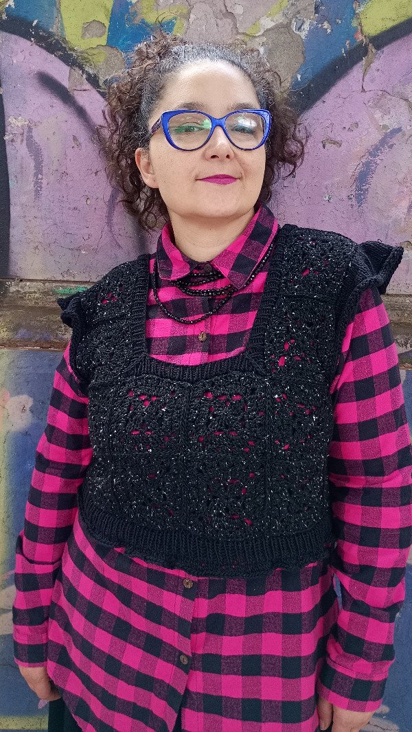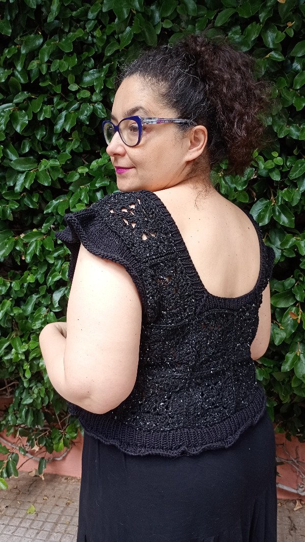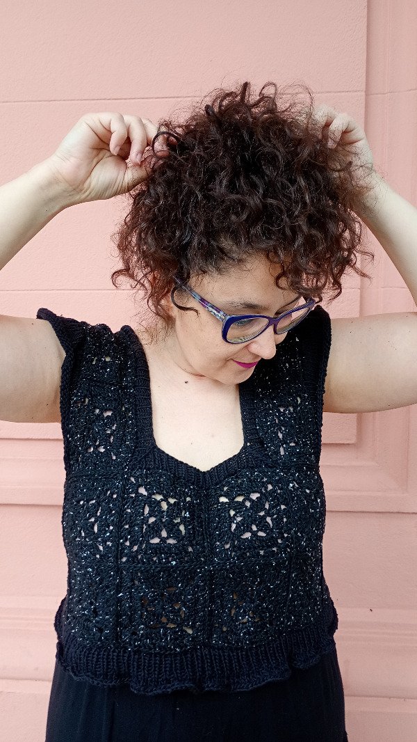 Esta es una prenda que se puede usar como remera o como chaleco, y la podés hacer con el grosor de hilado que más te guste, aunque recomiendo grosor DK o Worsted, o sus equivalentes en algodón: 8/6 ó 8/8. Si eliges un hilado más fino, vas a tener que hacer el talle más grande o una vuelta más a los cuadraditos.