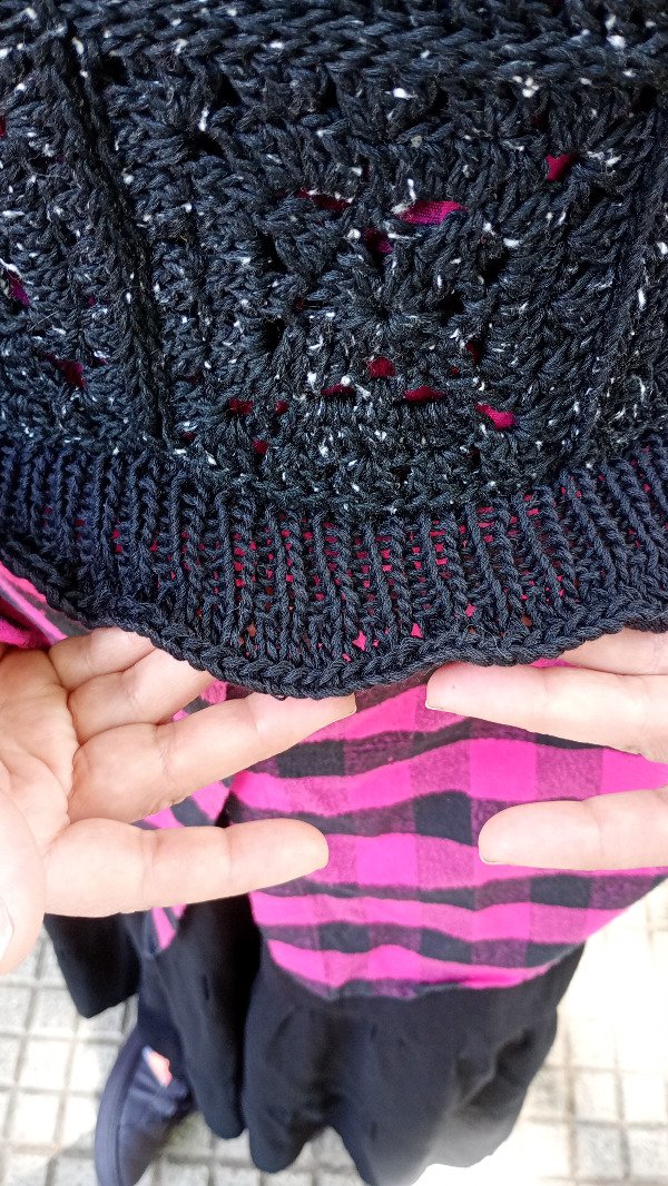 Vamos a combinar 2 técnicas: crochet y tricot circular. Yo usé un hilado estilo tweed, con hebritas de un color contrastante para los cuadraditos y el mismo hilado en color liso para las partes tejidas en tricot.